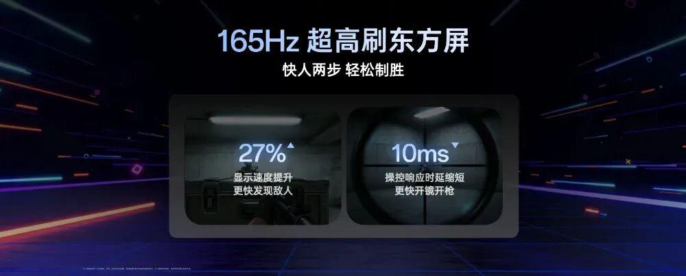 按照官方介绍来看,行业唯一 165Hz 超高刷高分辨率屏,游戏关键环节快人两步,165 帧打 120 帧降维打击,轻松制胜。