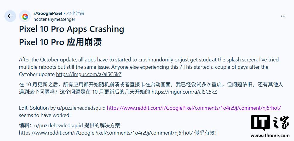 IT之家 10 月 14 日消息,据科技媒体 Android Headline 今天报道港联证券,现已修复了 Pixel 10 系列手机的 App 频繁崩溃问题,总算是让这款手机恢复了正常。