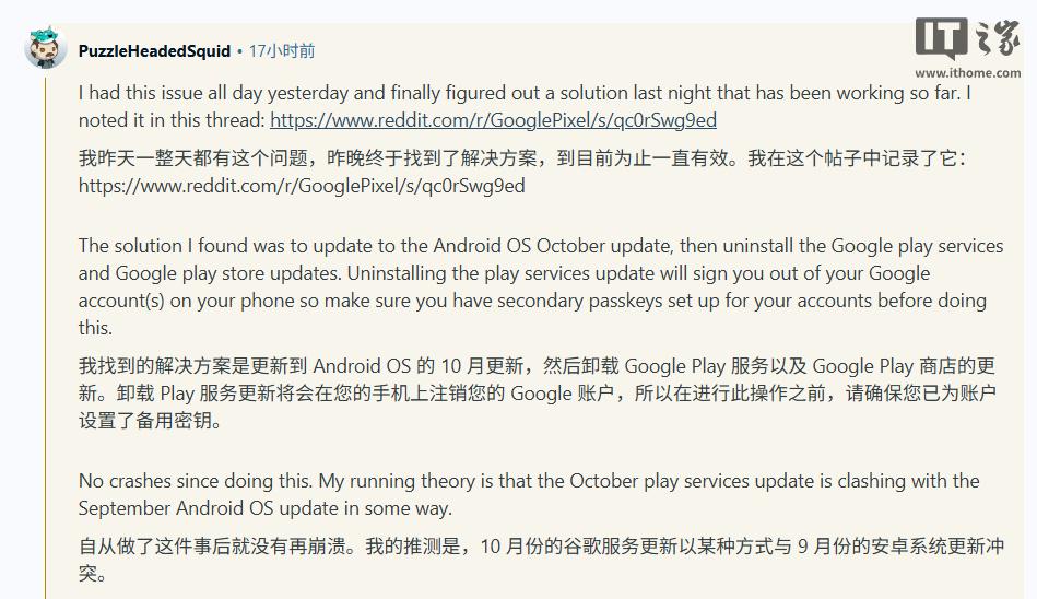 不过谷歌还没有公开具体调查报告,但多数用户都推测问题源自谷歌 Play 服务,毕竟出问题时有人尝试重装 Play 服务,结果可以解决。