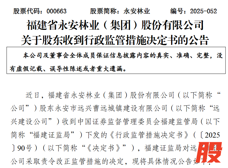 中新经纬12月2日电 福建省永安林业(集团)股份有限公司(下称“永安林业”)12月2日发布公告称牛宝宝,福建证监局对公司股东永安市远兴曹远城镇建设有限公司(下称“远兴建设公司”)采取责令改正监管措施。